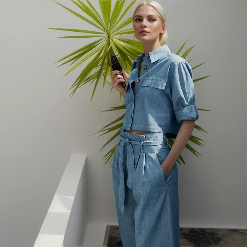 Autumn Fashion New Women’s Flip Decoration Casual Shirt and Belted Long Pants Set